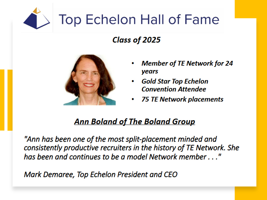 Congratulations to Ann Boland and to all of the recruiters being enshrined into the Top Echelon Hall of Fame in 2025!